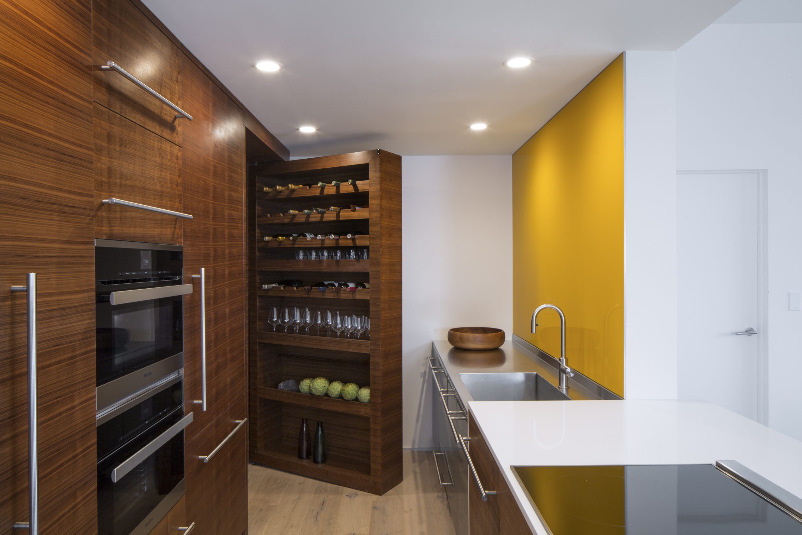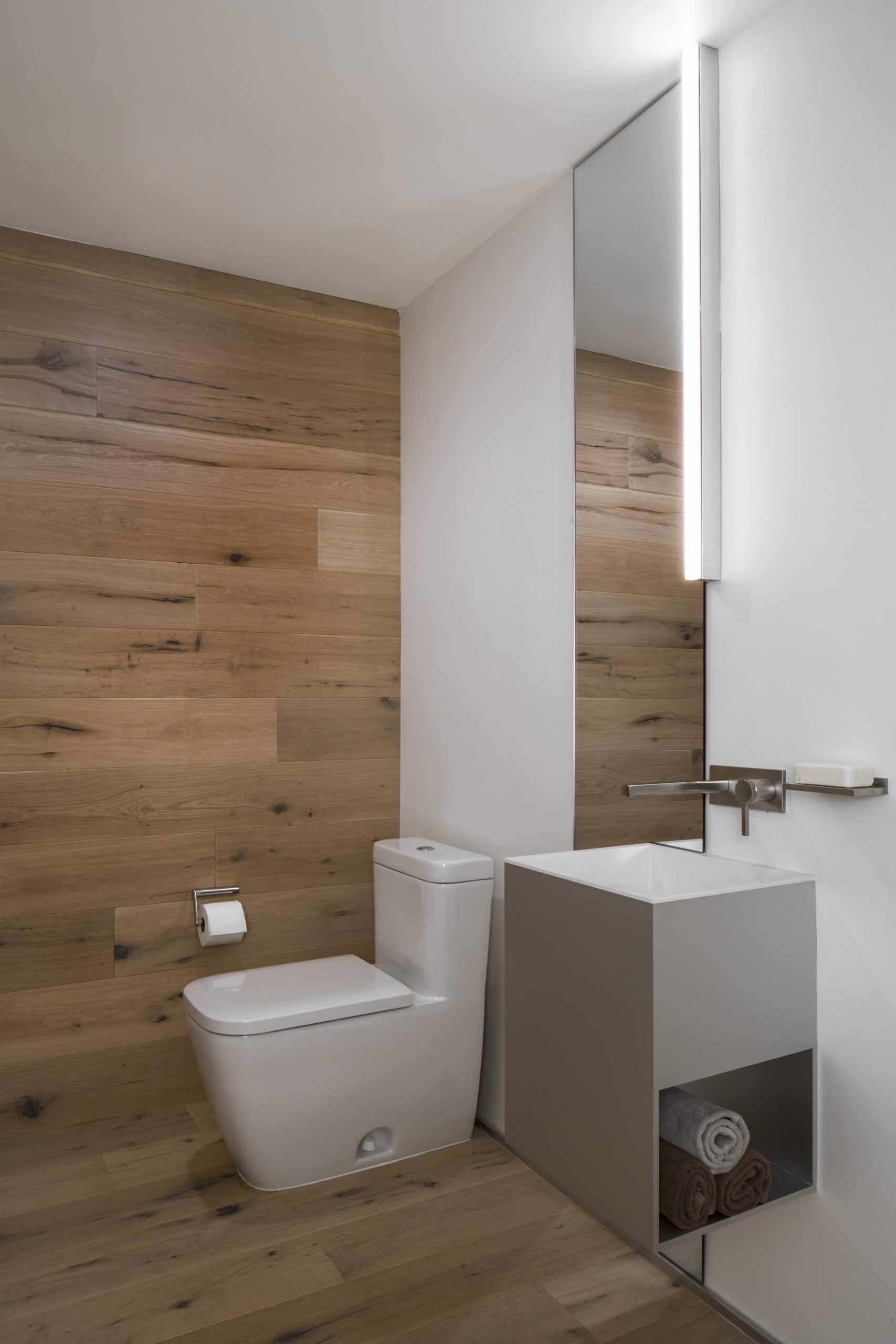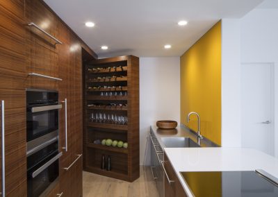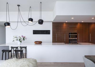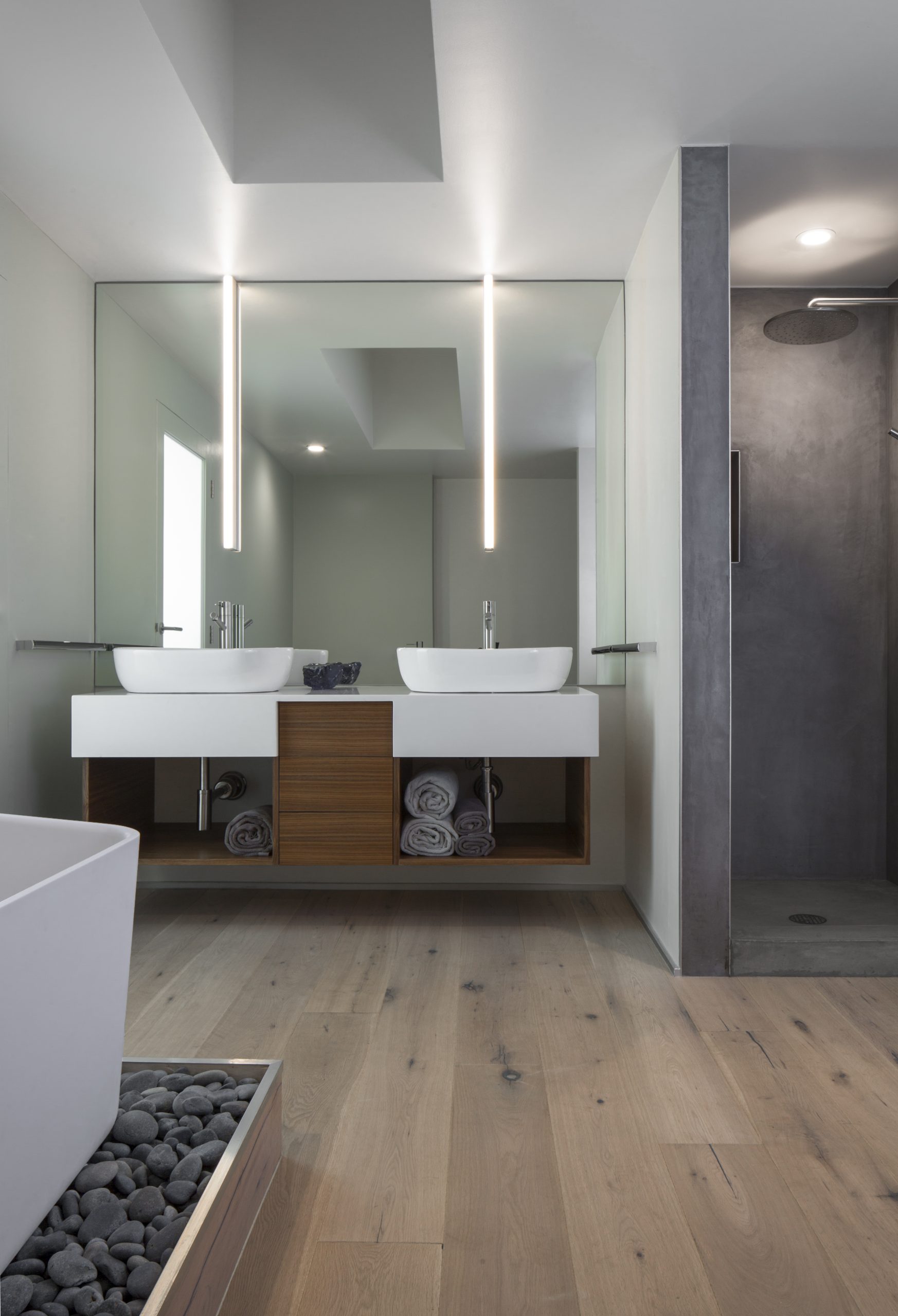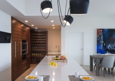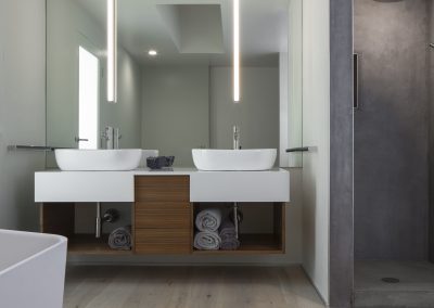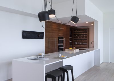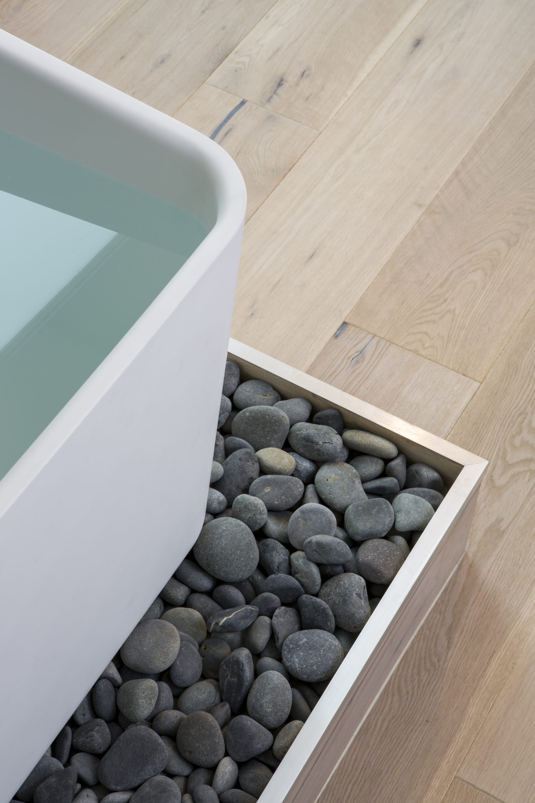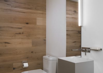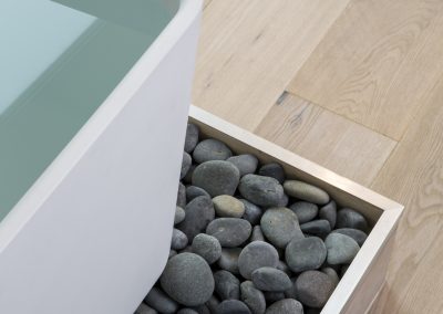 The eat-in kitchen island creates a multi-functional gathering point in the heart of the home. Meanwhile, the hidden wine cellar, seamlessly integrates with the walnut cabinets, dramatically transforming the space while adhering to the minimalist aesthetic. The oak floor seamlessly stacks up the bathroom wall and pebble stones surround the master soaking tub. The use of natural oak flooring throughout unifies the space and invites tranquility and serenity with its open­ness.
