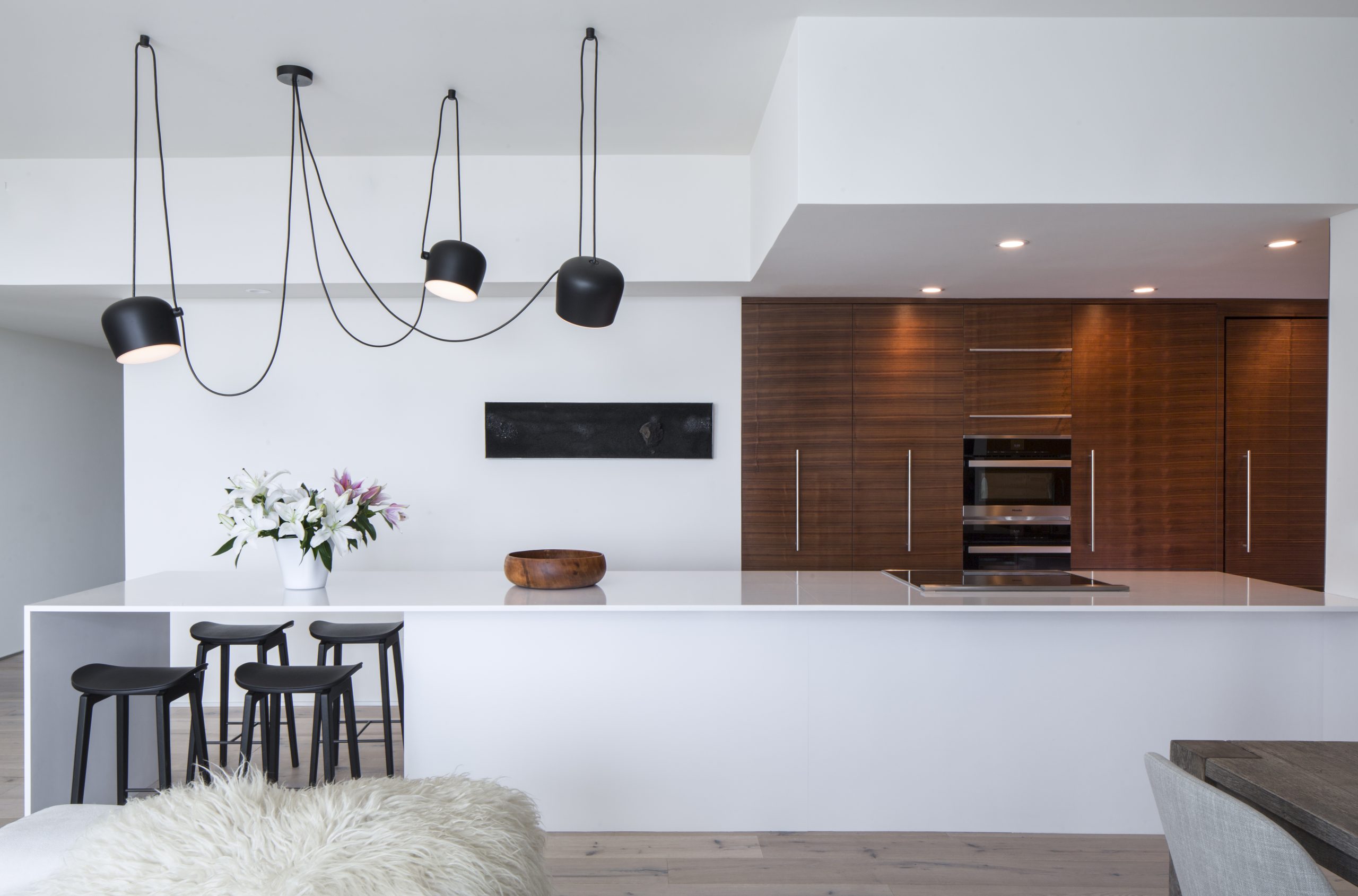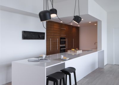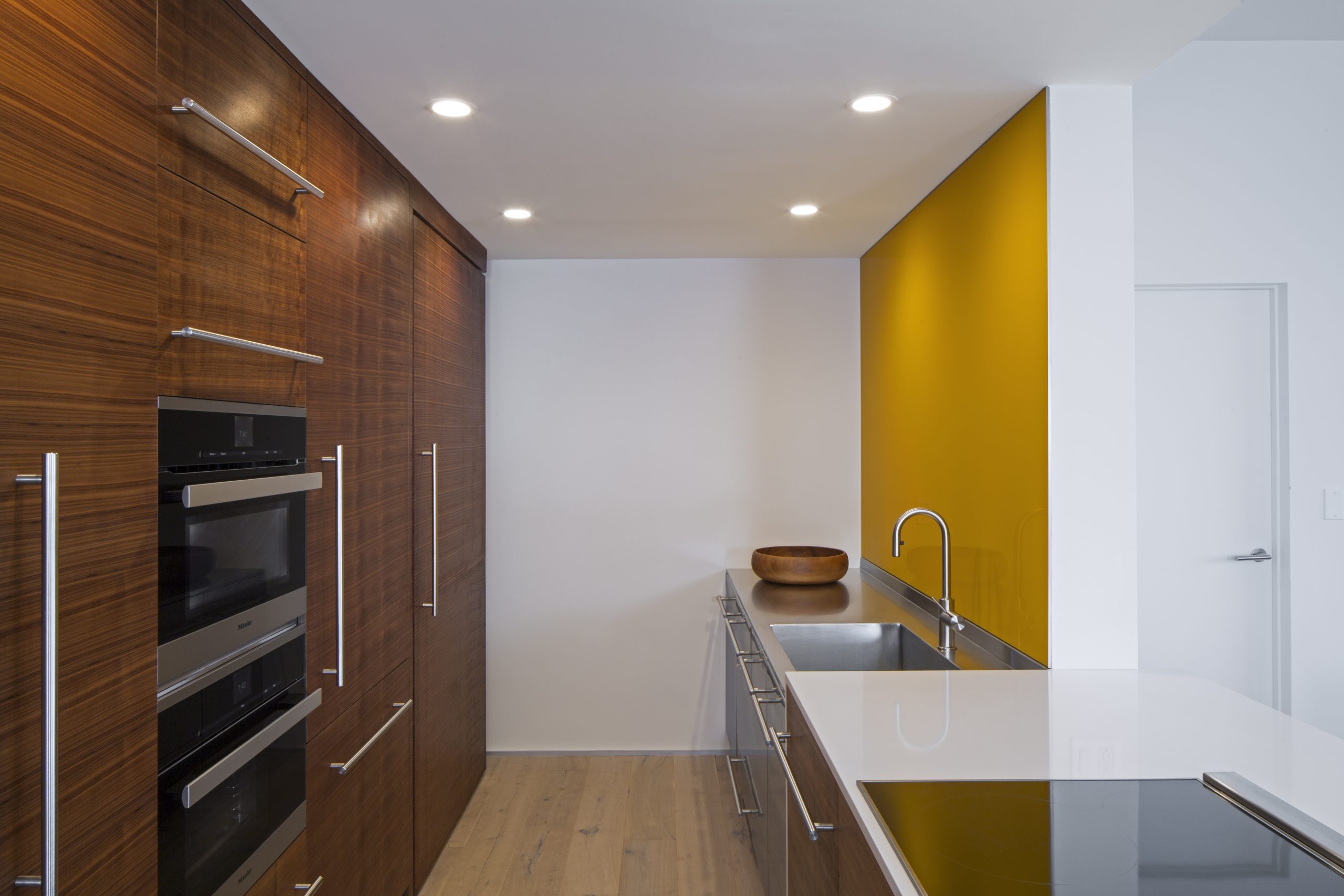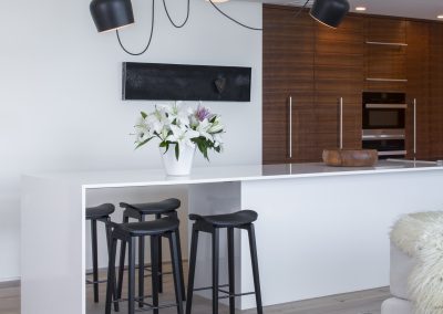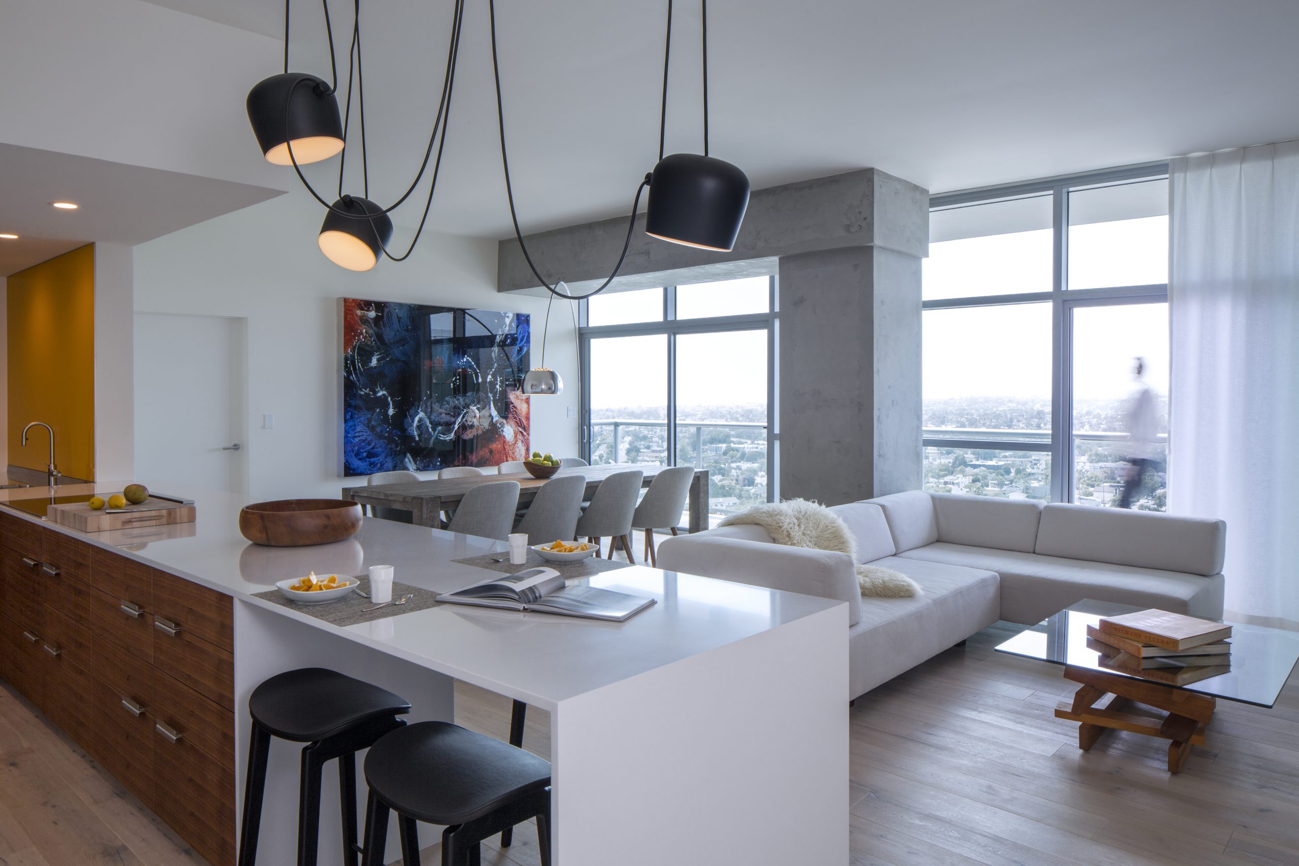 Drawing on minimalistic eco-conscious principles, this penthouse apartment is designed with a focus on functionality and a conscious effort to use materials in their most organic form. The design and use of color are inspired by dramatic Icelandic landscapes to create contrasting stimulating interiors. The yellow glass backsplash contrasts the blue sky seen through the expansive windows. The ocean-facing doors allow fresh air to circulate while maximizing natural light in the living space.
