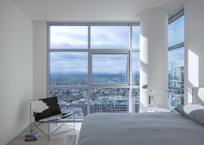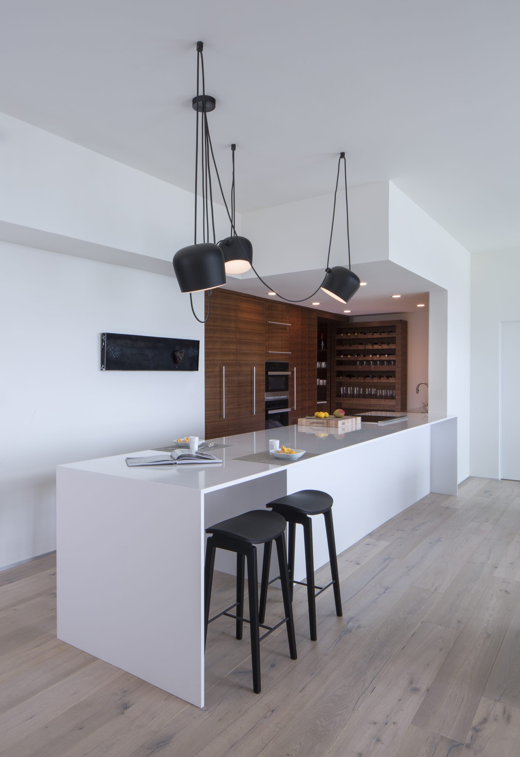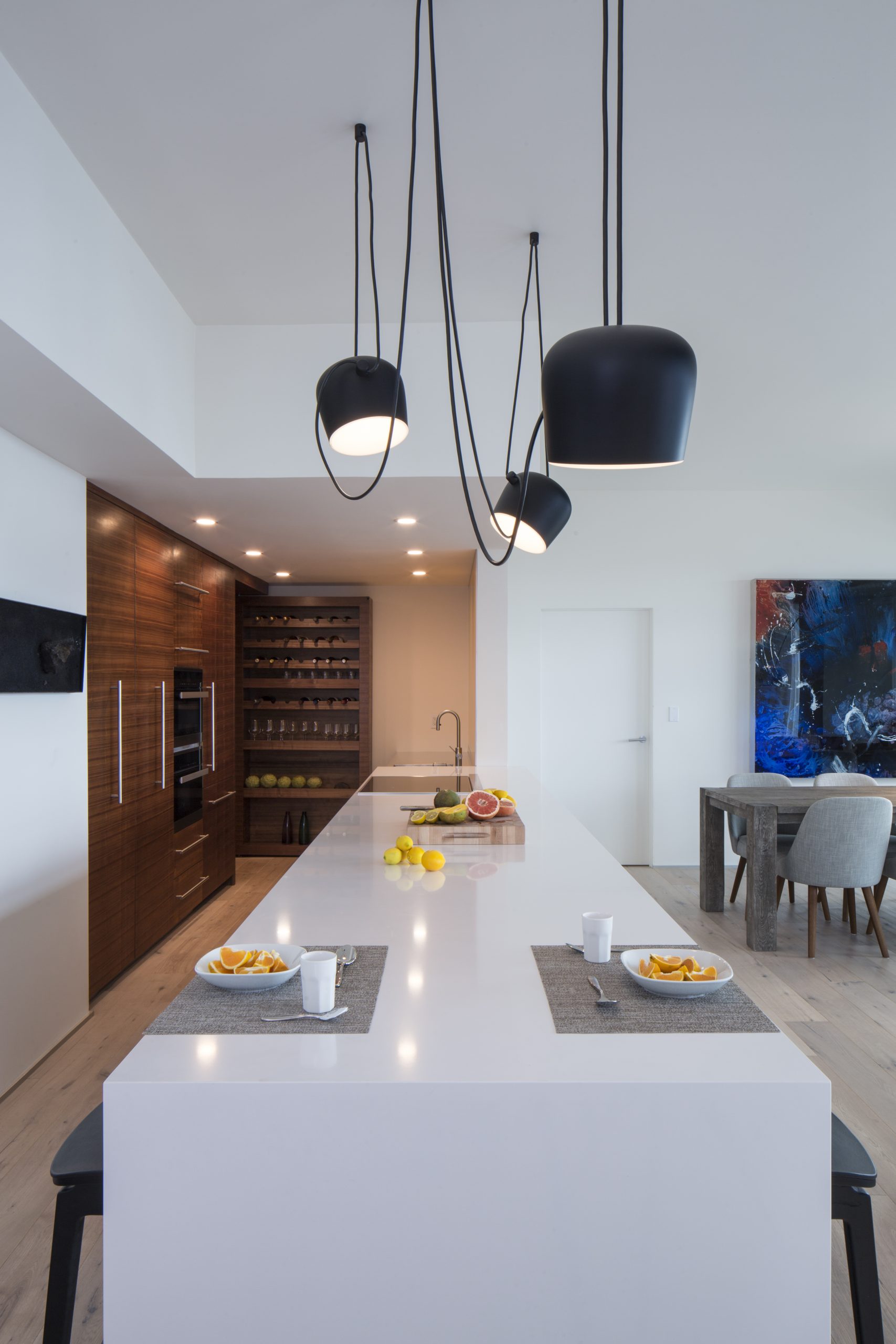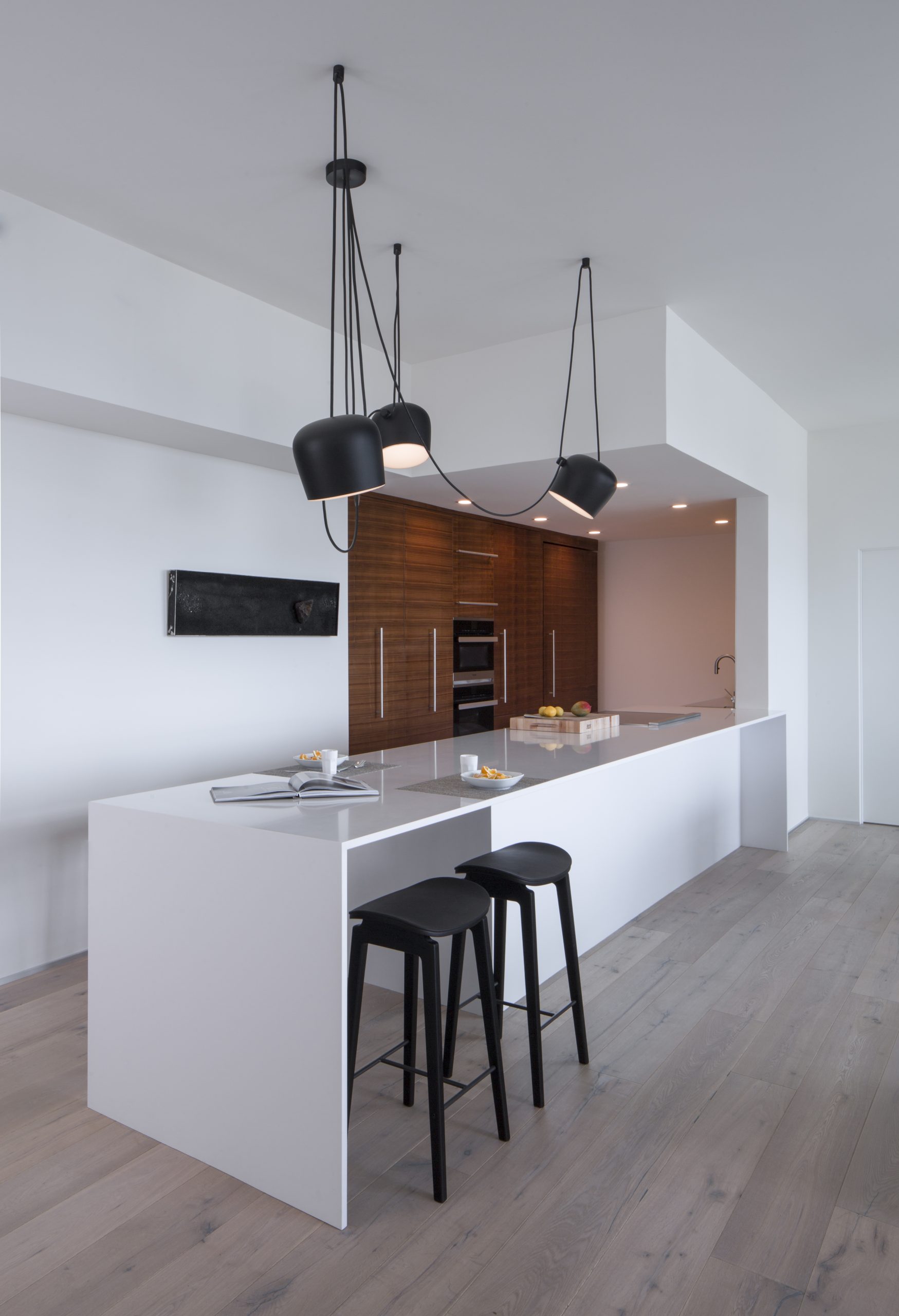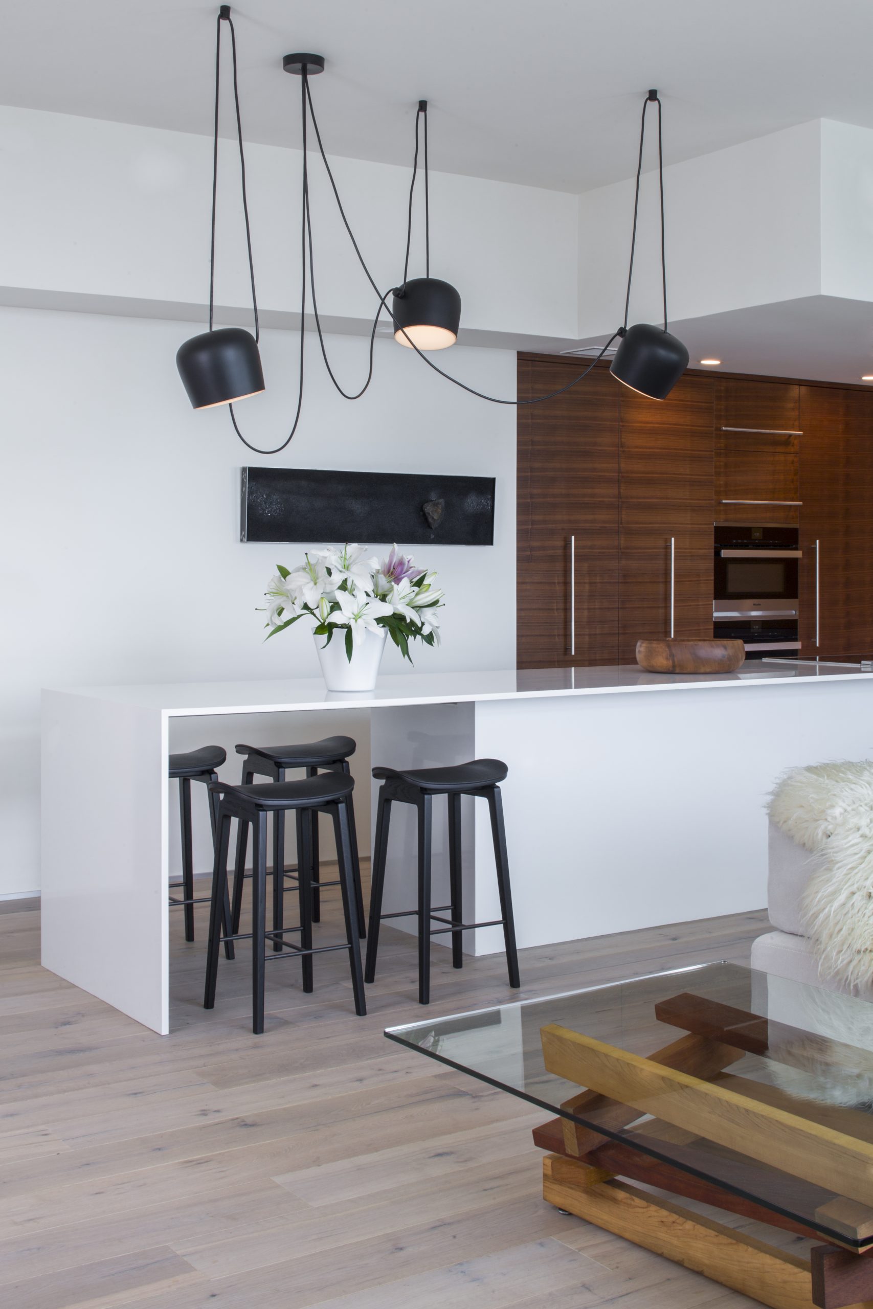 Drawing on minimalistic eco-conscious principles, this penthouse apartment is designed with a focus on functionality and a conscious effort to use materials in their most organic form. The design and use of color are inspired by dramatic Icelandic landscapes to create contrasting stimulating interiors. The yellow glass backsplash contrasts the blue sky seen through the expansive windows. The ocean-facing doors allow fresh air to circulate while maximizing natural light in the living space.